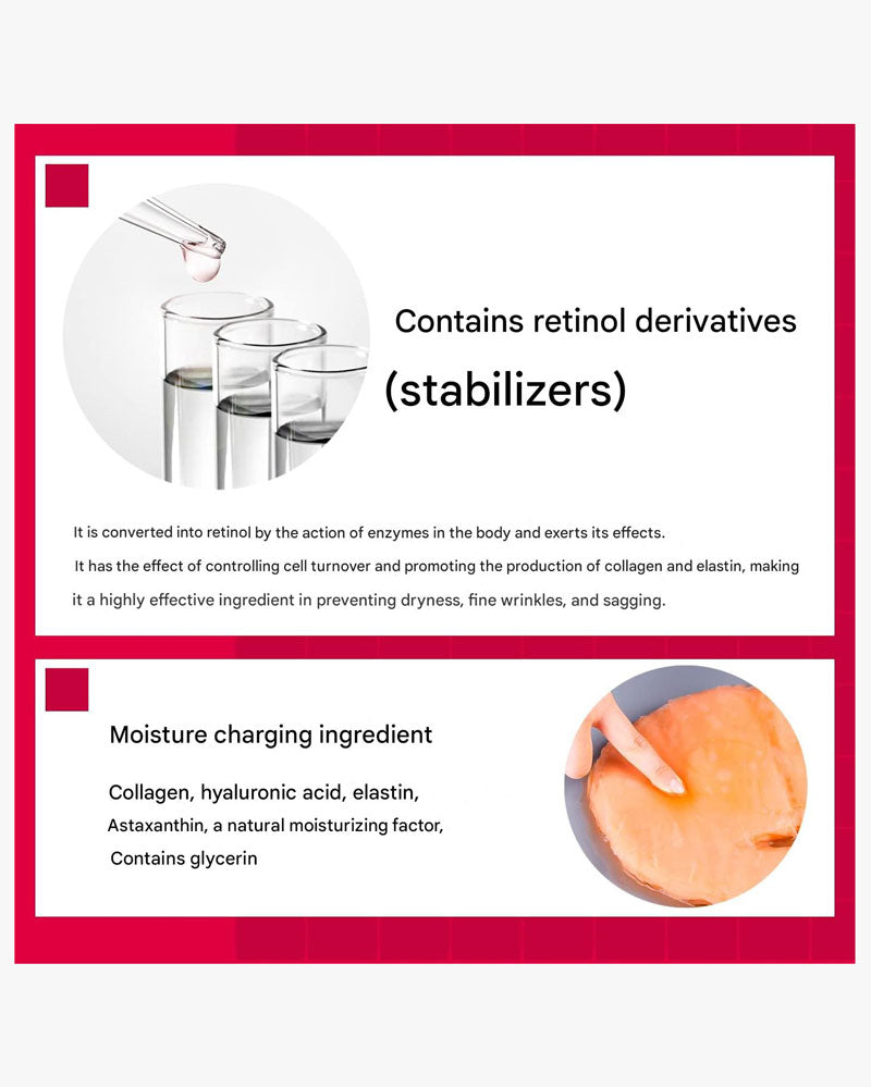 Water, BG, DPG, Glycerin, Ethanol, Astaxanthin, Serine, Tocopherol, Retinyl Palmitate, Sodium Hyaluronate, Haematococcus Pluvialis Extract, Hydrolyzed Elastin, Water-Soluble Collagen, EDTA-2Na, (Acrylates/Alkyl Acrylate C10-30) Crosspolymer, PEG-50 Hydrolyzed Castor Oil, Cetyl Ethylhexanoate, Xanthan Gum, Corn Oil, Tri-Caprylic/Capric Glycerides, Sodium Hydroxide, Phenoxyethanol, Methylparaben, Fragrance.